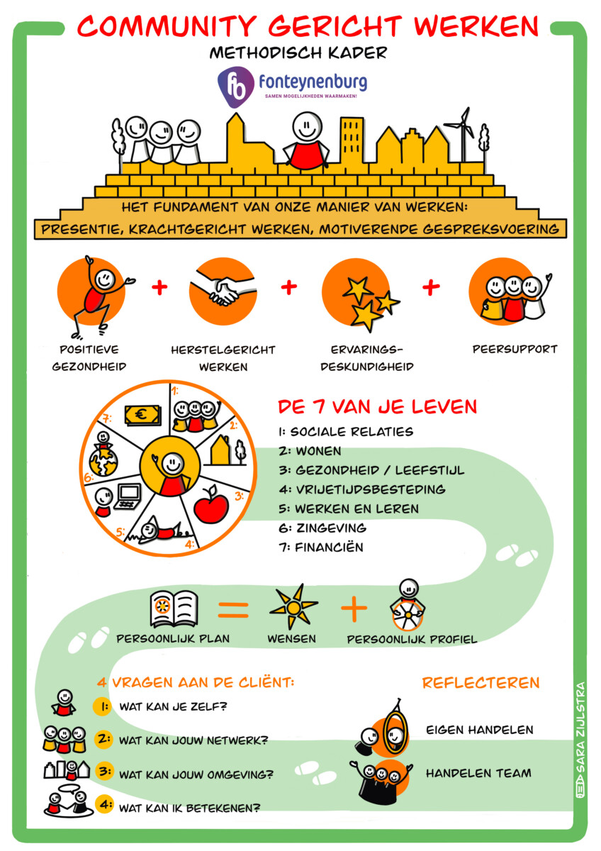 Fonteynenburg werkt communitygericht. Dat is een werkwijze die erop gericht is om samen met jou, je netwerk en met jouw omgeving zo goed mogelijk aan resultaten te werken waardoor jij zo goed mogelijk mee kan doen in de maatschappij. Onze begeleiding is ondersteunend om jou te helpen je leven in te richten op een manier die bij jou past en gaat uit van presentie, krachtgericht werken, en motiverende gespreksvoering en ervaringsdeskundigheid.